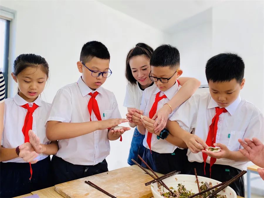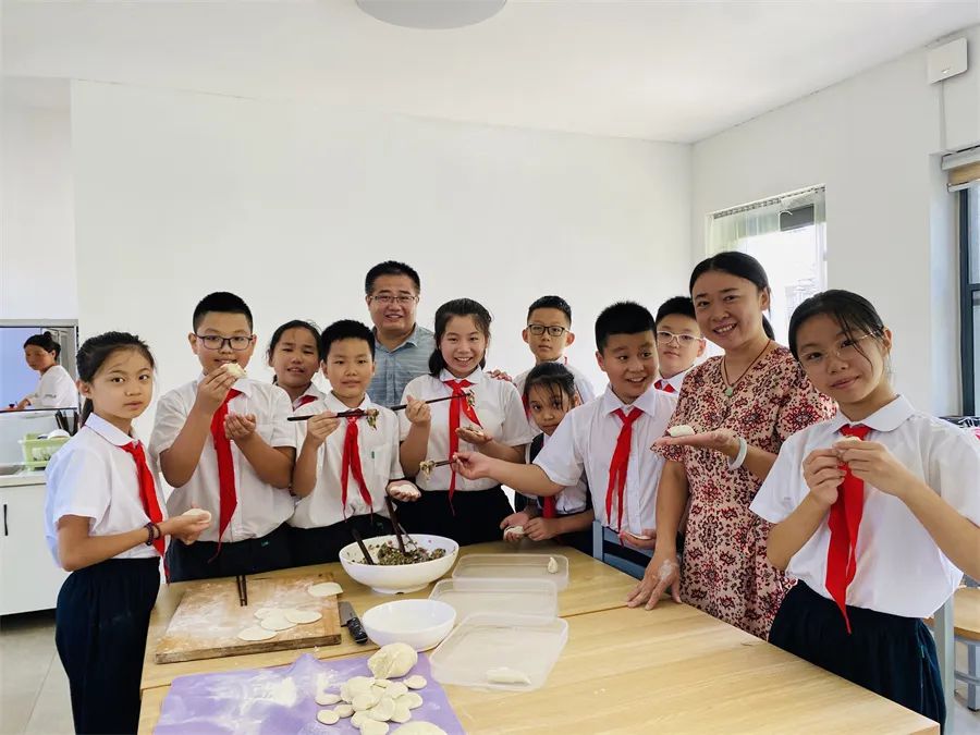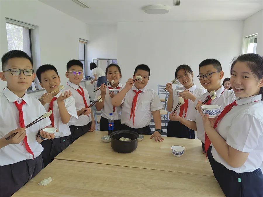 于是,在家長(zhǎng)們的幫助下,隊(duì)員們又變成小廚師,有的和面,有的調(diào)餡,有的搟皮,大家分工明確,動(dòng)手包起水餃來(lái)。不一會(huì)兒,一盤盤香氣撲鼻的茶葉水餃端上餐桌,吃著鮮嫩的茶葉水餃,喝著親手采摘的茶葉,隊(duì)員們臉上寫滿幸福。