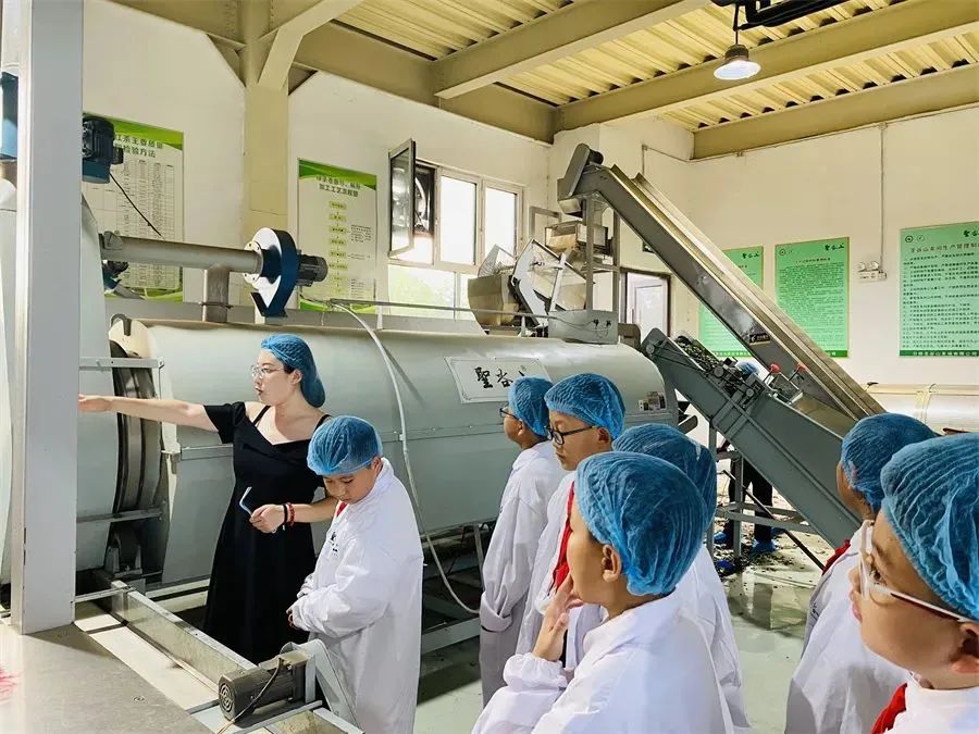中午時(shí)分,一筐筐新采的茶葉被運(yùn)回加工廠。隊(duì)員們立即穿上工作服,跟隨工人們一起加工生產(chǎn),探究茶葉的變化過(guò)程。嫩綠的新芽隨著傳送帶緩緩進(jìn)入機(jī)器,經(jīng)過(guò)烘焙、炒制、壓平等九道工序后,我們常見的日照綠茶才基本成型。隊(duì)員們看到一包包茶葉慢慢滑出,再次豎起大拇指,為科技發(fā)展帶來(lái)的便利條件點(diǎn)贊,更為自己的辛苦付出加油。