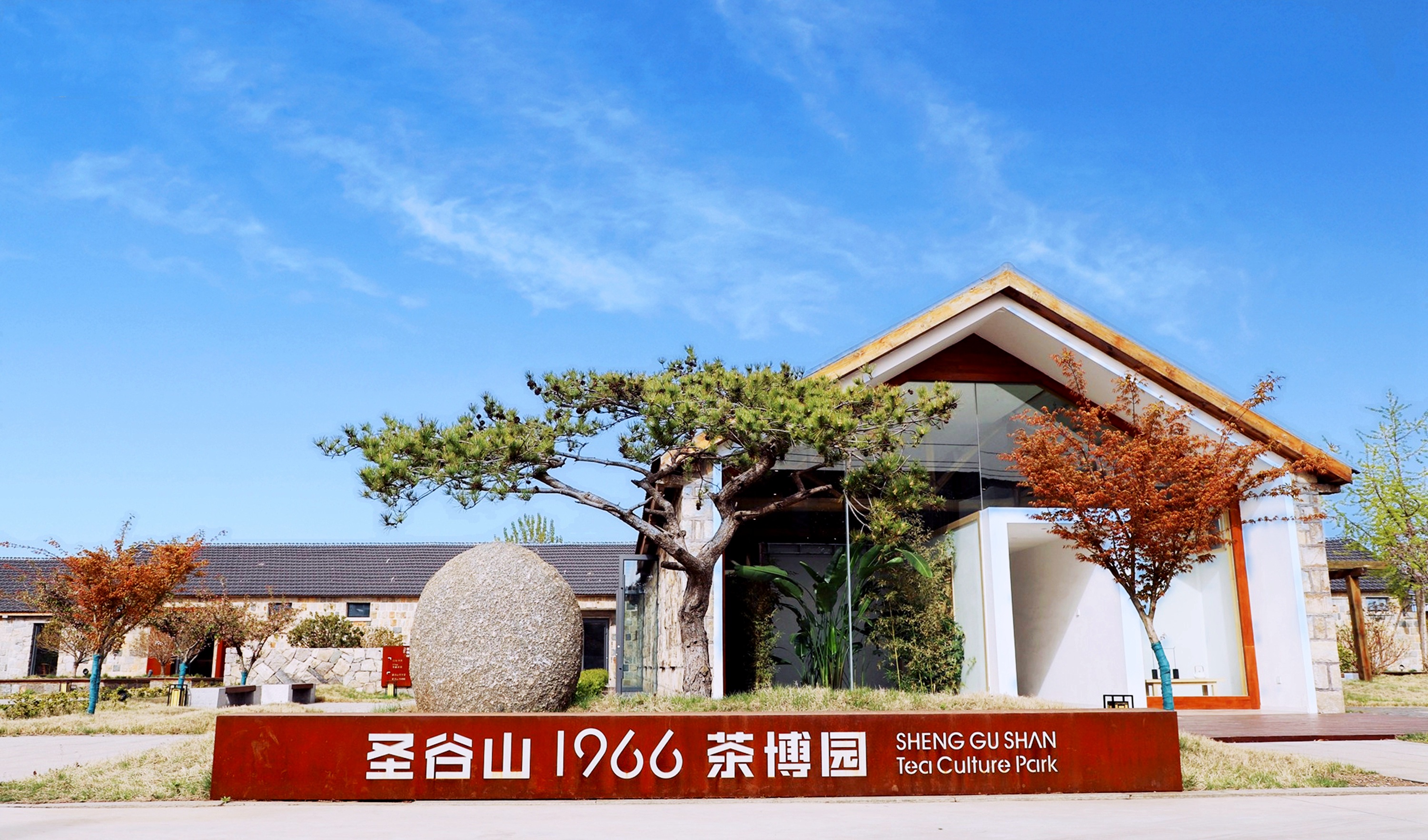 從日照出發(fā),一路向西,褪盡城市的喧囂,淡淡的云霧在田間游走,連成片的茶海望不到邊,記者在一處清新雅致的園子前停車,圣谷山1966茶博園,到了。